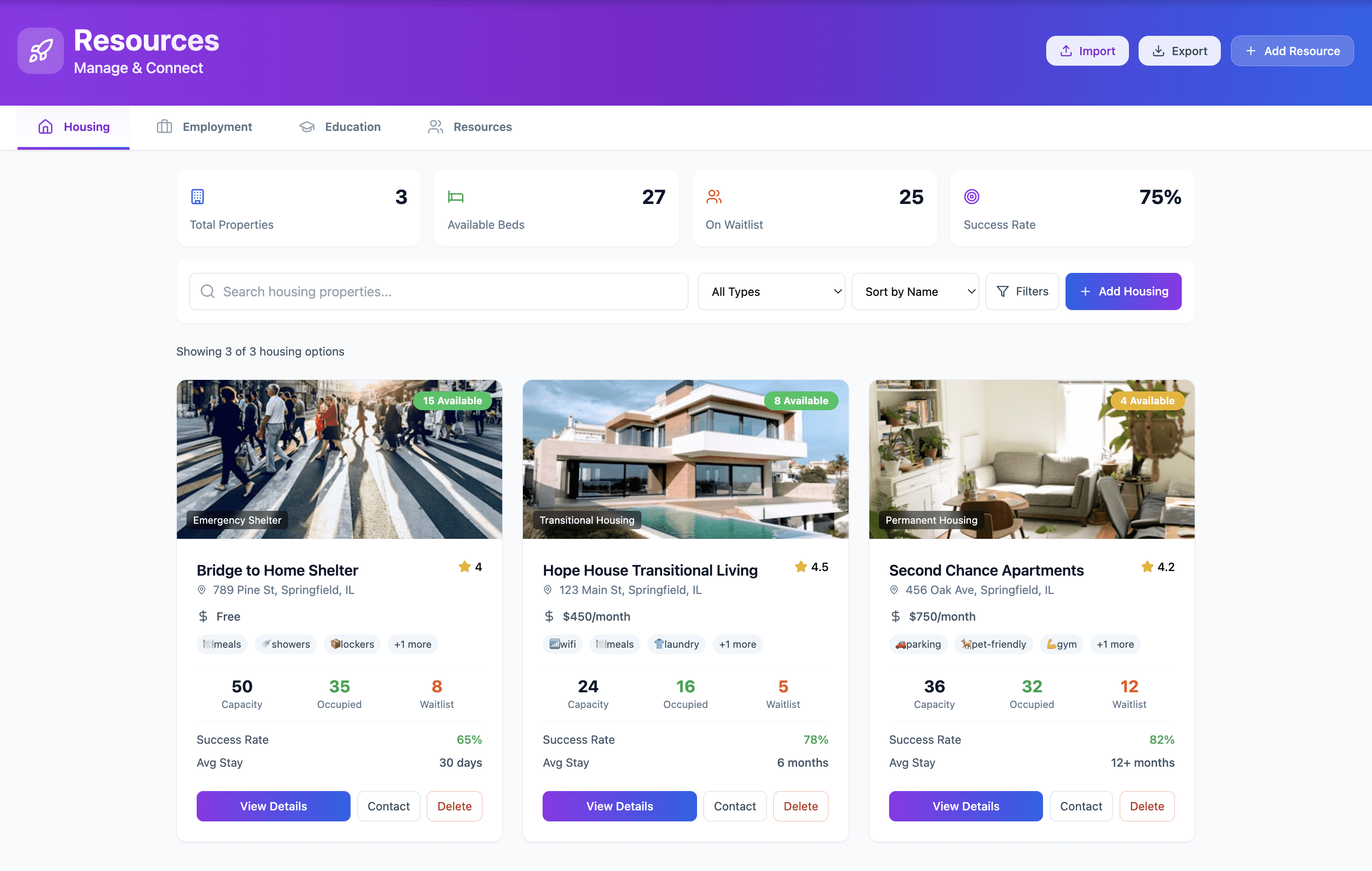 Live analytics track progress across housing, employment, and education, giving real-time metrics of impact.