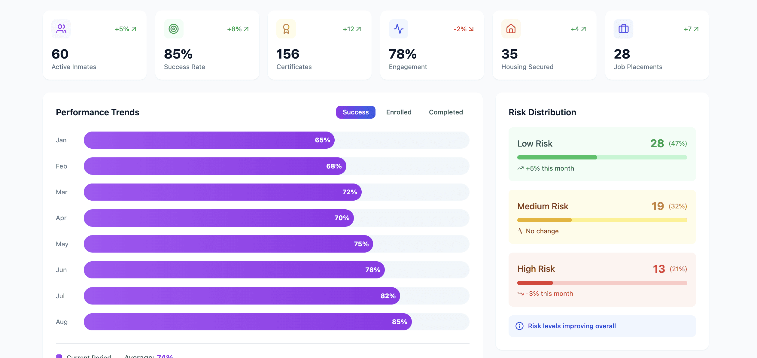 Reentry coordinators get instant insight into what’s working, including housing placements, job connections, and progress data - all in one dashboard.